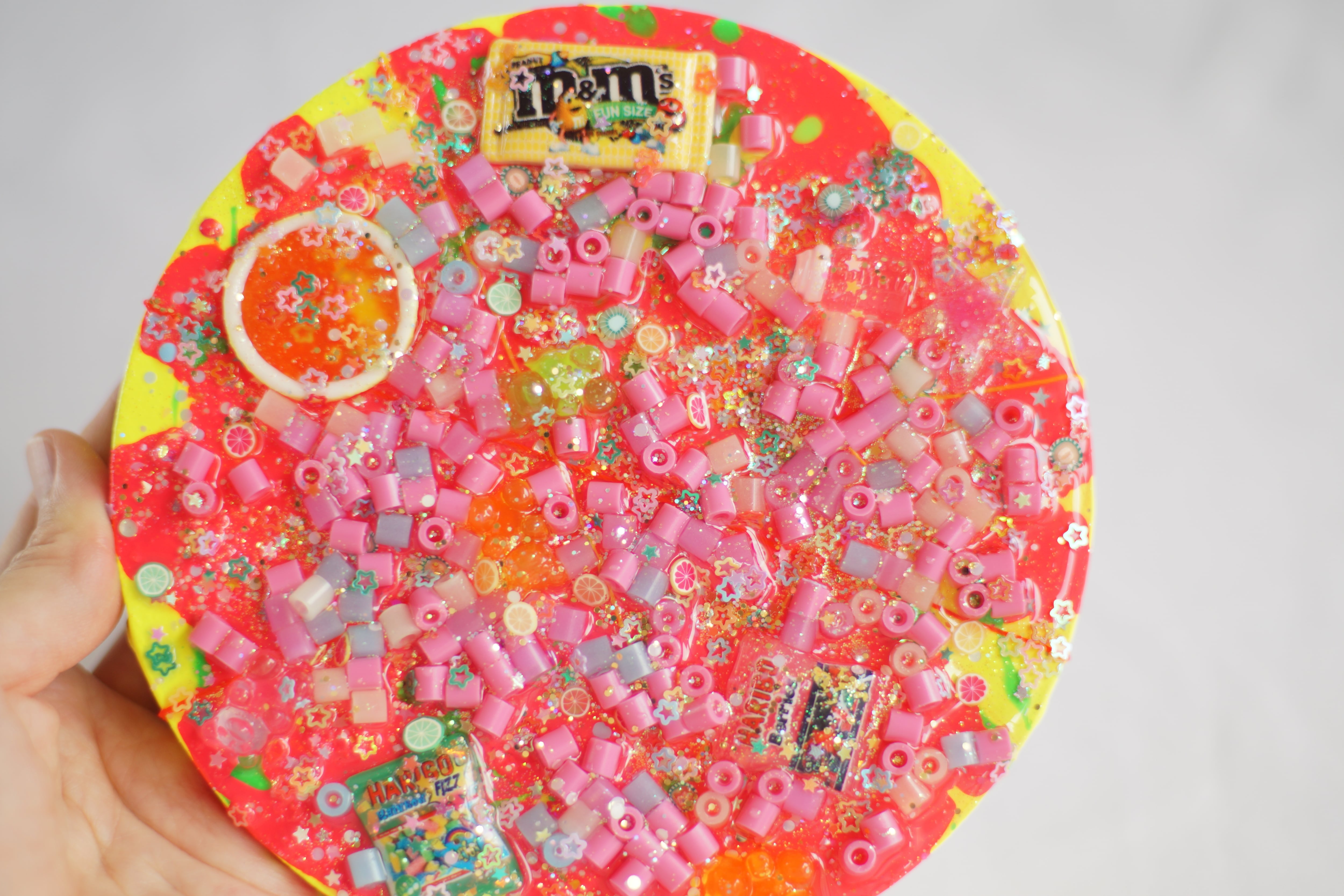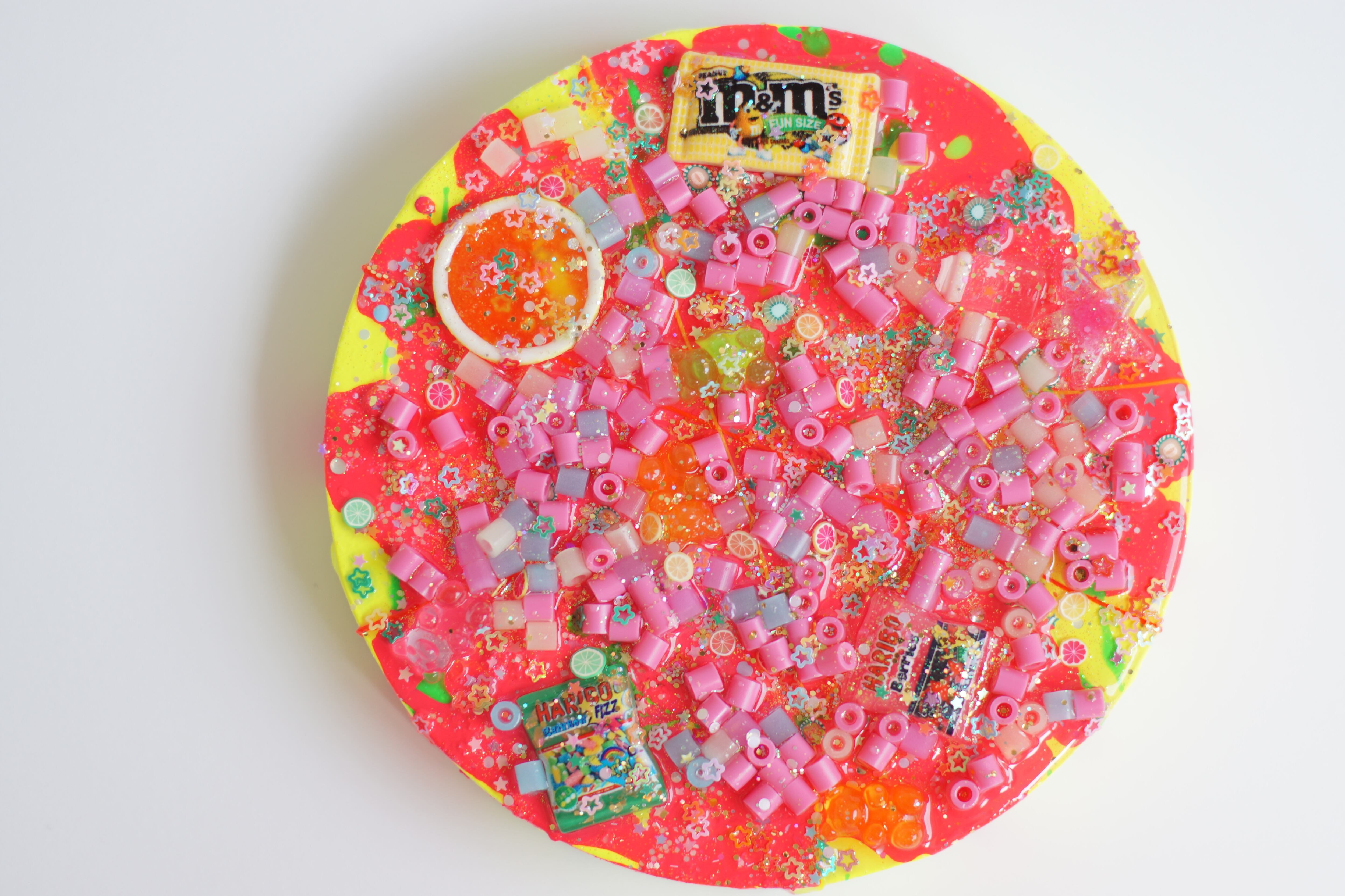 キャンバス、アクリル絵の具、レジン、ビーズ、ミニチュアパーツ、ラメ