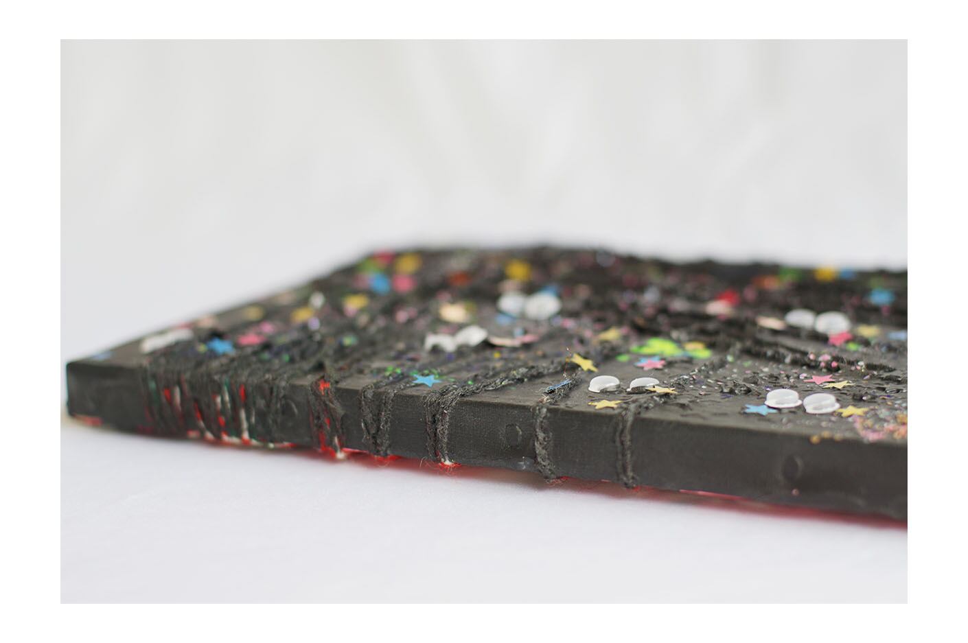 キャンバス、アクリル絵の具、毛糸、星のラメ、プラスチックパーツ